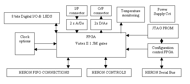 The HERON-IO5 provides a user programmable FPGA along with fast Analog Inputs and outputs for a HERON system. The FPGA controls the sampling of the A/Ds and D/As. The incoming digitised data is then fed to the FPGA where it can be processed, buffered or simply written to a HERON FIFO for use in the rest of the system. The outgoing digitised data is then fed from the FPGA where it can be processed, buffered or simply read from a HERON FIFO.